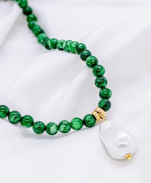 | Design | Contas de jade vibrante com pérola em tom dourado |