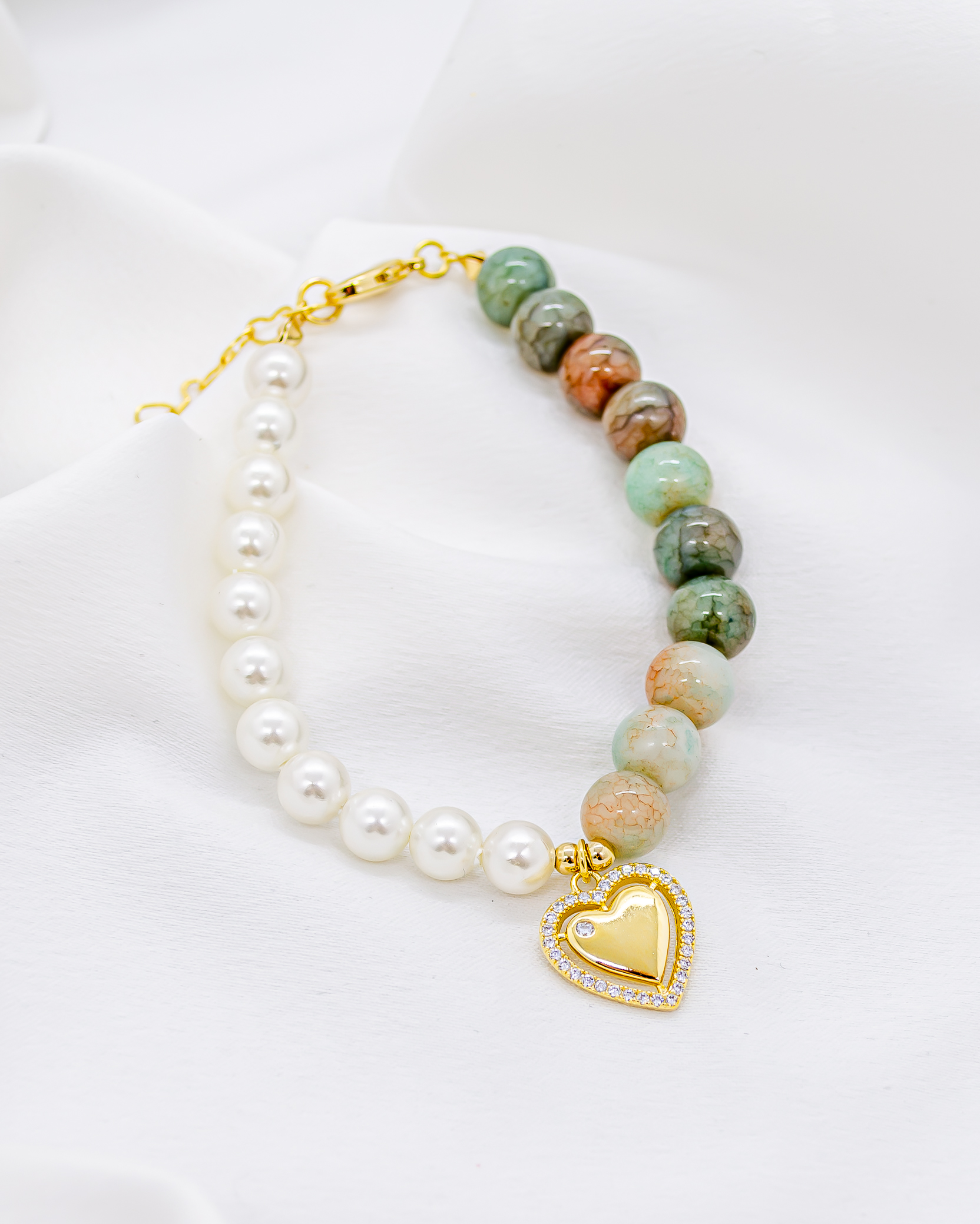 | Materiais | Pedra Shell, Jade Verde, pingente de coração banhado a ouro |